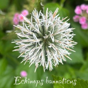 エキノプス スターフロスト 白いお花がてっぺんから咲いてきました🌿⚪️🌿 まん丸で イガイガ ポンポンだったモノが ツンツンした所から お花が出てきてます 球状のユニークなお花ですね⚪️🎶