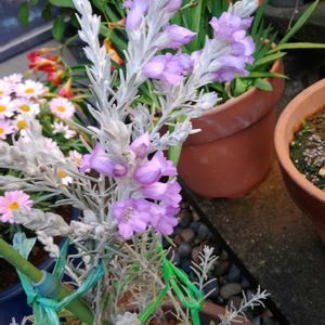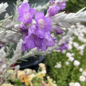 エレモフィラニベア 昨年の秋にハロウィン寄せ植えに使っていて、その後単鉢で冬の間は管理。 かなり大きくなり開花しました。 花首が重たいので支柱は必須😅 シルバーリーフに淡い紫のお花が可愛い🩷