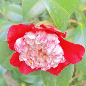 卜伴(ぼくはん)椿 月光とも呼ばれる。 白い唐子弁は雄蕊が小花弁に変形したもの。 赤い花弁は霜にあたり傷んでいたが、これは珍しいとパチリ📱