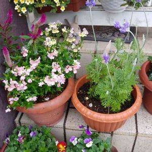こんにちは👋😃 千葉の空、晴れ☀️ 寄せ植えたちが元気に咲いてます🎵😍🎵