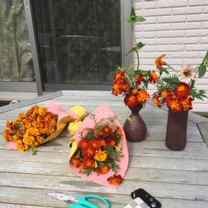 台風凄かった…🌬 昨日寝込んでたから花壇の台風対策できず💦 今朝荒れたお庭の片付けして、倒れたマリーゴールドやジニアを切って花瓶に挿してたんやけど花瓶が足りなくなり…😅 ブーケにしてご近所さんに配りました笑
