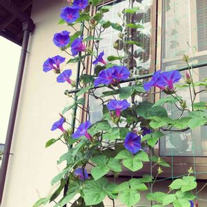 我が家のグリーンカーテンPart 1(琉球朝) 日に日に花の数増し、上に横にと。 ちなみにPart 2はフウセンカズラ💚
