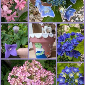 こんばんわ〜🌙 今日ははちゅの日、初参戦〜🦎🐍 うちにはいないかもと思ったら干支🐍✨ この子も多肉狩りツアーのイベント参戦でsゲットしてましたsawaさんのリメ鉢🐝✨ 何とコラボさせようと考えた結果… 今日出会った花たちとご一緒に😆 ←大好きな人の家紋◇▢ 結構有名🛶✨ →↘同じ苗の子✨ 額紫陽花って中心にも小さい花があるって初めて知りました〜✨ そして、日増しに濃くなるみたい✨ ↖毎朝見かける1輪の小さい子✨ ↗縁が白い子✨ ↙中が白い子✨ 紫陽花って色の変化も楽しめる✨ だから七変化と呼ばれるのですね🎶 毎回出会うのが楽しみ🎶