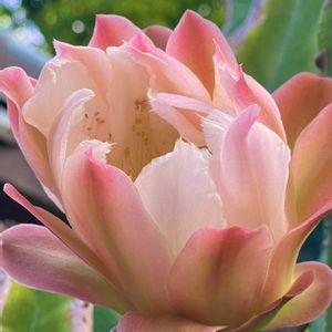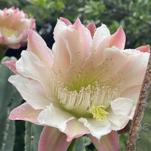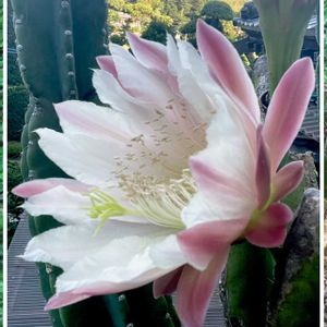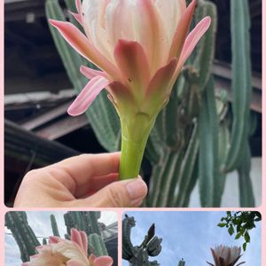 柱サボテンです。 実は、お花が終わったと思ったら 昨日の夜1輪だけ咲きました。ところが昨日は風が強くて、危ないので脚立に登るのをやめました。 4枚目21:40位に脚立に登らず撮影してみました。 ならばと、今朝5時に見てみたのが1枚目~3枚目です。 萎んできちゃっていました💦最後なので手に取ってみました。 3枚目、とうとうお花が無くなってしまったサボテンの姿です。