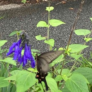 ジャコウアゲハ♀🦋 すそにきれいな模様があり それは素敵な美女でした 紫のきみ 舞に惹かれし 雨の中💟 蝶々の名前は ちしゃ 様に教えて いただきました。