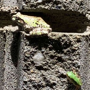 パパ、待って僕を置いてかないで‼️ お前は誰だ‼️ わしの子では無い‼️ パパ🐸😭 わしの子ならば🐸 この、モダンな柄のはずだ‼️ 下のチビちゃんもっと近づけようと しましたが、これ以上はいくら せっついても微動もせずにあしに触ると ぴょんと跳ねて逃げてしまいました😁