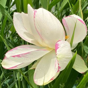 お洒落な蓮の花 3種類のハスの花がありましたが この色は初めて見ました 風に煽られて撮りにくくて なんとかものにできました 変わりだね 優雅に揺られ きわだちて