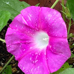 雨にも負けず☔️ 風にも負けずに 咲いていた朝顔の花 先程の見回りで見つけた 下葉の陰になりわからなくて 何やら赤いのが見えるから 見ると一部破れていて なんとか貼りつけて😄 撮りました