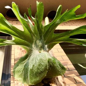 さらに大きくなったかな、⁇🌿 ビカクシダ って綺麗なんですねーほんとうに。 と毎朝部屋を出るときに愛でております。 にしても、向かって左側の葉が迎えた当初に傷つけたのか折れてしまっていて、、 かわいそうに。ごめんよ〜〜 土間で思いっきり水やりしてあげたい。 (がテラスは家族の洗濯物でいっぱい)