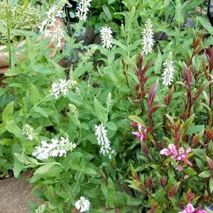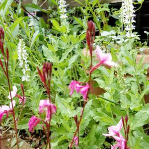 サルビア ネモローサ スノーヒル/ コンパクトガウラ リリポッブピンク スノーヒル2番花、今年はキレイに咲いています😊去年は白ガウラに上から被さられ育ちませんでした😫😣リリポッブも2番花なかなかキレイ😃でも植えた場所が窮屈だったみたい💦 本当にスカスカ位に植えないとダメですね