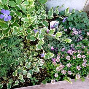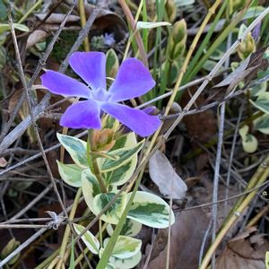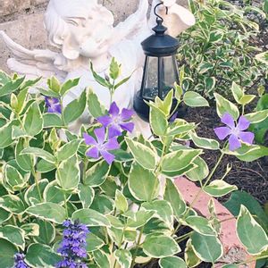 蔓日々草・ツルニチニチソウ(斑入り) 斑入りの葉の華やかな色合いと、 薄く破れてしまいそうな儚げな花が魅力。 しかし、繁殖力が半端ない😱 名前の通り長い長い蔓を伸ばし、 ランナーの様にあちこちに根付いて 子株を増やし広がっていく😓 1~2年に1度、 新芽が出る春先に、根元から刈り込まないと大変な事に... 今春、花壇の改造計画の1つ、 傍のゴールドクレストの大木の枝を伐採。 日当たりが良くなり、ますます茂りそうな予感😓 可愛いと思えるのは今だけ?😝