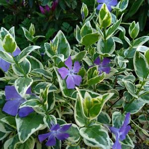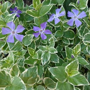 斑入りのツルニチニチソウ💜 お花が咲き始めました🎶 繁殖力が強いので いつも抜いたり、✂️したりしています(ू•ᴗ•ू❁) 葉っぱが涼しげです🎶