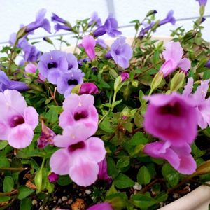 こんばんは🌇 1️⃣ スーパートレニアカタリーナブルーリバーは冬越しをして、花が咲き始めました。 2️⃣ スーパートレニアカタリーナピンク🩷こちらも同じく冬越しです。 3️⃣ 去年から咲いてるビオラは今年は長く楽しめてます。