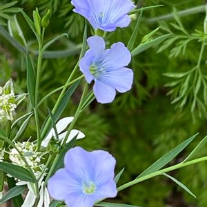 こんにちは😃 秋蒔きしていたリナムが今年は発芽してからの生育が悪くて諦めてたけど、少しだけ咲きました。 いつもだとこの時点で切り戻しをして再度、2番花を楽しむのですが、種取りをしたいのでこのまま、花がら摘みをせずに放置です💙