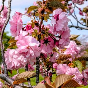夏日30℃ 近くの公園 サトザクラが満開🌸 初めて見た可愛い~! 葉っぱもちょっとアクセント これも可愛いかった。