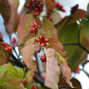 ハナミズキ 花水木 別名 アメリカヤマボウシ ミズキ科ミズキ属ヤマボウシ亜属の落葉高木 北アメリカ原産 昨日投稿した ミズキと同属です。 ミズキの仲間の中で 特に花が目立ち美しいので このお名前が 付けられたそうです。 家の近所で見かける ハナミズキの中で この木が 毎年 一番乗りに 実り 紅葉します。 同じ お庭にいるハナミズキの木たちは 9月はまだ 青い葉っぱなんですよ。 不思議~ 赤くて かわいい実、毒があるので 人は 食べられませんが 鳥たちには ご馳走! 撮影 2020 9/21 お花投稿 2020 4/23
