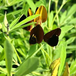 🖤ロータス ブラックムーニー🖤 お店で📸 気になっていたコチラ、お花が咲きました🖤 豆科みたいなお花で黒くてカッコイイ‼️ 裏?の黄色とのコントラストも良いですね👍