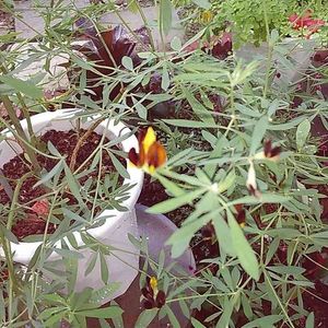 他の子同様丸刈りにされたブラックムーニーも、ワサワサして蕾がつき始めました♪ 管理不足で何度かハダニにやられてますが、強剪定でも復活してくれるのでズボラでも平気です😅 隣のソフォラは暴れまくってたので昨日枝の整理をしました。添え木がなかったので壊れた猫じゃらしの棒で代用。オレンジ色で目立つ🤣 マメ科は葉っぱが可愛いなぁ😊🌿