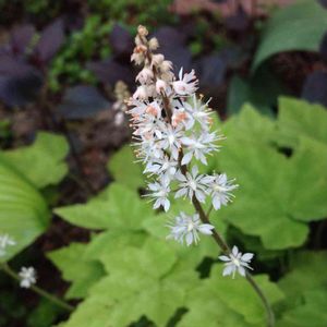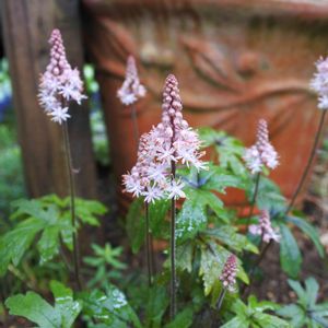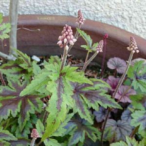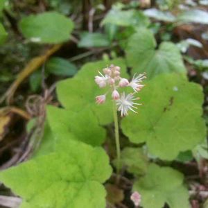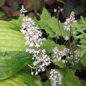 ヒューケラのコーナーにあったから ヒューケラだと思い込んで ヒューケラ丼に植えてた☹️ 可愛いお花が咲いたので ネームタグを見直したら ティアレラ サンセットリッジ 垂れるタイプって書いてあった😅 同じ ユキノシタ科だったけど ヒューケラと名乗っちゃダメなんかな😆 垂れるタイプってのも チョット楽しみだわ🎶(*´∀︎`*)