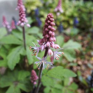 穂先咲きの 【ティアレラ ウィリー】 ユキノシタノ仲間 淡いピンクのギザギザ小花が 可愛い♥️💕😆 昨年11月にも花を付けましたが 春が本番のようです 次々と蕾が上がってきました 後ろの早咲きチューリップは 終盤を迎え 次の🌷チューリップの蕾が ブッシュ咲きの様です❤️
