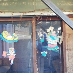 8 そして最後のお写真は、裏庭サイドの窓に貼ってあった、色褪せた貴重なシール3点である。 今のところ レッツシュートそろばんワールド の往時を偲ばせる唯一の 遺跡 である。 解読してみよう。 女の子のカバンの柄がそろばんのコマの、どアップなのが泣ける。 数少ないそろばんアイテムで世界観を彩ることを強いられた、クリエイターの苦悩の跡が、ヒシヒシと伝わってくる、、、 そしておなかにそろばんをセット出来る最重要キャラ=ラッコ(の親子)。 やはりここでも カバお 役は カバ と相場が安定しているカバくん。 胸にまさかの SOROBAN が横文字で(&おへそがちらり)‼️ これだけである、、、残された手がかりは、、、 クールジャパンとやらのジャパニメーションと、伝統ある珠算教室との、奇跡のメディアミックスは、時空を遥かにフライングゲットし過ぎたようだ、、、 日本にサッカーブームは根づいた。レッツシュート の機運は全国的に高まった。が、誰もそれを そろばん塾 には望んでいなかったみたい、、、 今日、悲しいかな、レッツシュートそろばってる子どもは、誰もいない。 しかし、確かに存在したのだ。レッツシュートそろばん塾 は。空き家がそれを教えてくれている。空き家のみが、、、 シールを貼ろう、窓に。レッツシール‼️ 人が去り、記憶が薄れても、空き家の窓にいつまでも、痕跡が残るように。