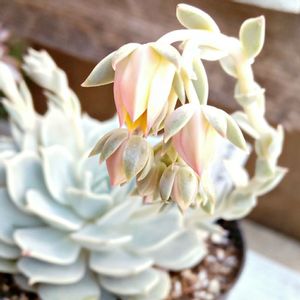 エケベリア属、セクンダ(クララ)? 値札のシールに薄く小さくセカンダって印刷されてたので忘れない様にセカンダと書いたけど検索すると違ったみたい😅 皆さんのより葉が薄いけど厚くなるのかなー。 花芽は写真撮ったあとにカット✂