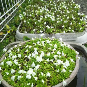 🤍アズーロコンパクトホワイト🤍 猛暑の中で頑張って咲いています💕 もう一度切り戻しかなぁ〜😅 スカイブルーの方は切り戻してから まだお花はほんの少しです💦