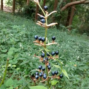 ヤブミョウガ 綺麗な実がなっていました。 後ろにヤブミョウガの白いお花が群生してます。