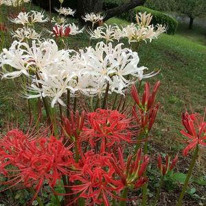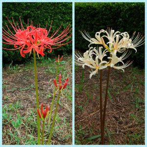 今日のお花 ヒガンバナ 梅の木の下に紅白のヒガンバナが咲いています。 赤のヒガンバナは蕾が多く、咲くのが遅いようです。
