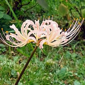 彼岸花 紅白の彼岸花が咲く場所にそろそろ咲いたかな?と見に行きました。 紅白の彼岸花はまだでしたが、一本だけ淡い、ピンクオレンジのお花が咲いていました。 初めて見る色です。