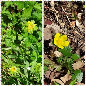 ヘビイチゴ だと思います。 右 可愛いお花 左 もう少しで実が出来ます。 ヘビイチゴは、バラ科キジムシロ属に分類される多年草の1種。和名の語源については実が食用にならずヘビが食べるイチゴ、ヘビがいそうな所に生育する、イチゴを食べに来る小動物をヘビが狙うことからなど諸説がある。毒があるという俗説があり、ドクイチゴとも呼ばれるが、無毒。