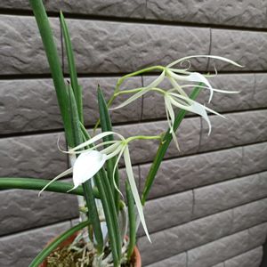 Brassavola nodosa ブラサボラ ノドサ 🧚咲きました🙌4年かかりました😅残念ながら、蕾一つは落ちてしまいました💦 4枚目、根っこがカリカリにからないように、上に水苔をつけてあります 5枚目は2021.5、コルク付けした頃の写真です