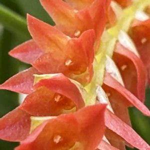 Coel.wenzelii セロジネ(旧デンドロキラム)ウェンゼリー 2023年1月に伊豆の野中洋蘭園さんから、ヤンミンオレンジと共に購入 一枚目はスマホに接写レンズを付けて撮影しました🎶 ズームしているので大きく見えますが、花の幅は7mm 中の葯が肉眼で微かに見える程度👀😅 今回は花芽が3本、購入した年は花芽が沢山あったので作下がり状態😅 植え替えしなくては🤔