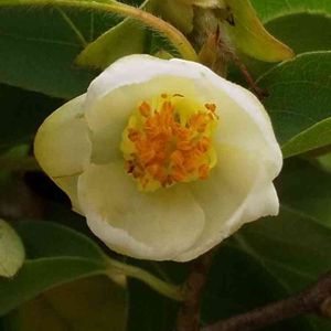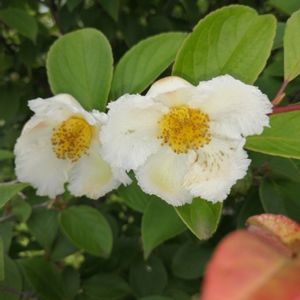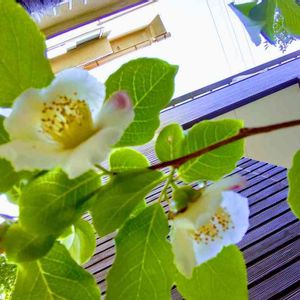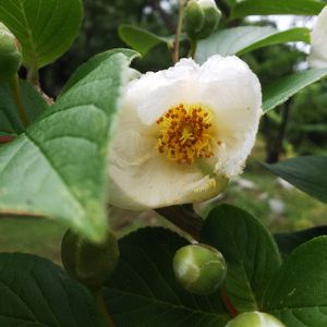 夏ツバキ 我が家のシンボルツリーとして植えました。 毎年たくさんの花をつけてくれます。 朝に咲いて夕方には落花する一日花。 儚さがまたいいのかな。