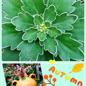 🏷毎月15・16日はド真ん中の日 自分で植えたけど何か忘れた子💦 菊のような葉っぱで、毎年葉っぱは出る(^◇^;) 今日、覘いたら小さな花芽のようなつぶつぶが中心に✨ なんだろ~? 追記✨教えていただきました 『イソギク』です💛 あ!クマドラキュラ博士にコポたんがカボチャにされちゃった~🎃 ハロウィンの魔法かな~💜💜💜 はたして、コポたんはカエルに戻れるのかー(ΦωΦ)💦💦💦