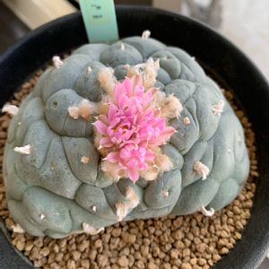プニプニの質感が大好きなロフォフォラ。 花が咲いた。 ピンクの透明感が美しい。 この株は サボテン肌も個性的でお気に入り。