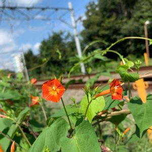いつものランニングコースにて。アサガオやヒルガオの仲間と思いますが、綺麗なオレンジが青空に映えます😃