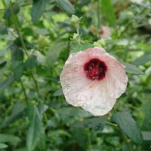 こんにちは~❗ 午前中のランニング中の花 芙蓉を小さくしたようです。 雨の後で、花びらが少し透けている。 風に揺れて撮すのが大変でした。