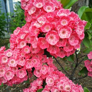 鮮やかなカルミアで庭が華やかです。 傘のような花が集まって咲いています。