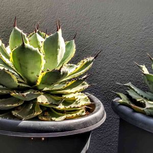 僕のアガベたち ネットで購入してポリポットのままだったり、窮屈になってたりしていたけど みんな同じくらいの大きさだから 同じ鉢に統一して植え替えました うん‼️ カッコイイ (((o(*゚▽゚*)o))) 自画自賛