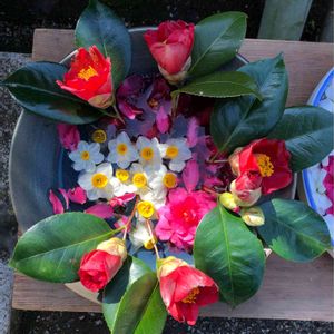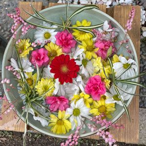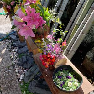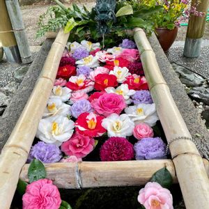 竹神社⛩にて 花手水🌹🌼🌸🌺💐 伊勢神宮に仕えたお姫様👸斎王が 暮らしていた社があったのでは、 と言われています