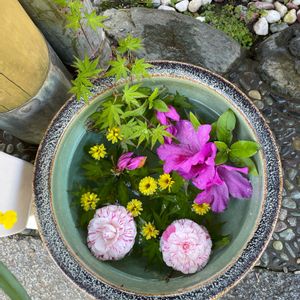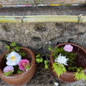 花手水シリーズです💐🌸🌼 竹から流れる水の音が辺りに響いています💕💕💕
