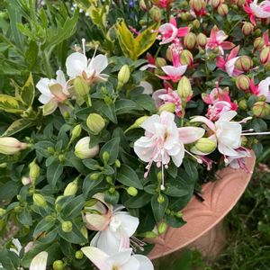 . . 𖤣𖥧𖥣𖡡 フクシア'プーニー' 𖥣𖡡𖥧𖤣 下向きに垂れ下がるように咲く様子が イアリングのように可愛らしいお花𓍯.*° 優しいピンクと白のグラデーションが愛らしい🪴🤍 とてもコンパクトにまとまり、 春から秋にかけて長い期間楽しめます✨ *育て方* 日当たりの良い場所を好みます☀️ただ夏の直射日光には弱いので、風通しの良い半日陰で管理してください🌱 水やりは土の表面が乾いたらあげてください🚰