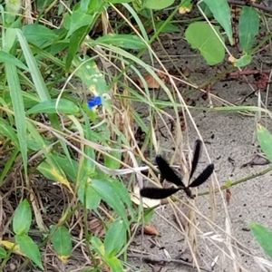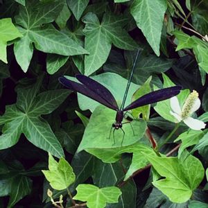 カフェの裏を散策したら黒い蝶々のようにヒラヒラと飛ぶトンボがいました。 周りを探すと何匹かがヒラヒラ♪ 川沿いなので生息地みたいです。 葉っぱにとまって羽を閉じたり開いたり。 神様トンボ、初めて出会えて心ほっこり♡