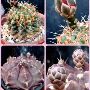 サボテンの蕾がいつの間にか大きくなりました。咲いたら又投稿します👍 上側 グリーンに赤の蕾 『翠光冠錦』 (スイコウカンムリニシキ) 下側 エンジ色 『麗蛇丸』(レイジャマル) どちらも ギムノカリキウム属 スマホには 大雨特別洪水警報が 何度も繰り返し届きます サボテン棚には雨よけ様の不織布を付けて被害防止をしています雨の音もなくサボテン達は守られて居ます。👍💞💕❤️👍