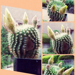 『金小町』 ノトカクタス属 とても太くなり蕾も沢山付いたのでお水をやろうと鉢を持ち上げたら何と 後ろ側にこんなに大きな穴が空いてるでわ有りませんか🥶😱😡👹👿 棚にのっている表側は何も無かったので気が付きませんでした。 ビックリ👀‼️ 直ぐに殺虫剤(多肉様の) を噴射し枯れずに済んでいます。 お花を咲かせてくれるのを待っています。👍💞💕❤️