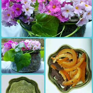 私が作った花瓶にサクラソウを生けてみました。 お友達から頂いた 橙(だいだい)で作った 『ピール&オランジェット』とても美味しかったですよチョコが少しなのが👍ですね。 私の陶芸作品 (織部焼)に盛って見ました。 下側が盛る前の出来上がったグリーンの子皿です。