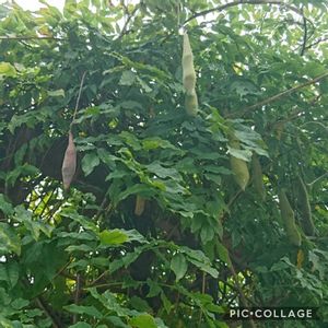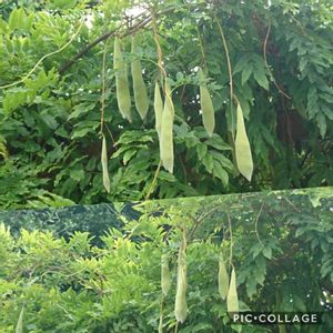 夕方の散歩にて。 支那藤(シナフジ)のようですが、 合ってるとかいな~😆 すごい‼️ 豆みたいな実が😳😃