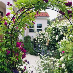 おはようございます。 アーチ部は開花が進んで 中庭は満開越え。 アーチから格子窓まで4m弱 高低差と抜け感を作り、 アーチ越しの遠近感を出して 🌹コントラストも大事に、 素人なりに設計。 この抜け感と視点が大好きです😌