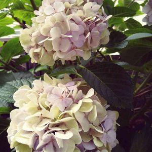 白いアジサイ"品種不明" "ただの白いのアジサイ"💦という触れ込みでお迎えしたアジサイ。 日影のお花は真っ白ですが、陽当たりの良い所に置いてあるお花は、なんか色が付いてる😳 陽当たりが良いとお花の色か良くでるのかしら🤔?
